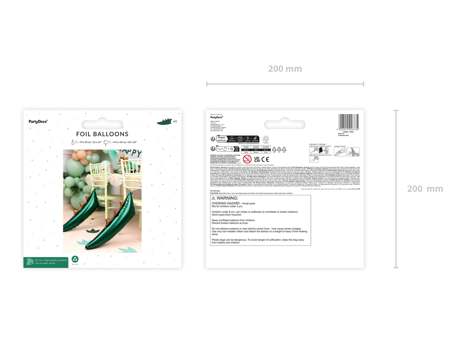 Foil balloon Dinosaur tail, mix of colours, size before inflation approx. 79 x 35 cm (31 x 14''), size after inflation approx. 74,5 x 25 cm (29 x 10''). Inflate with air. Set contains straw and ribbon in green colour with length approx. 1 m.