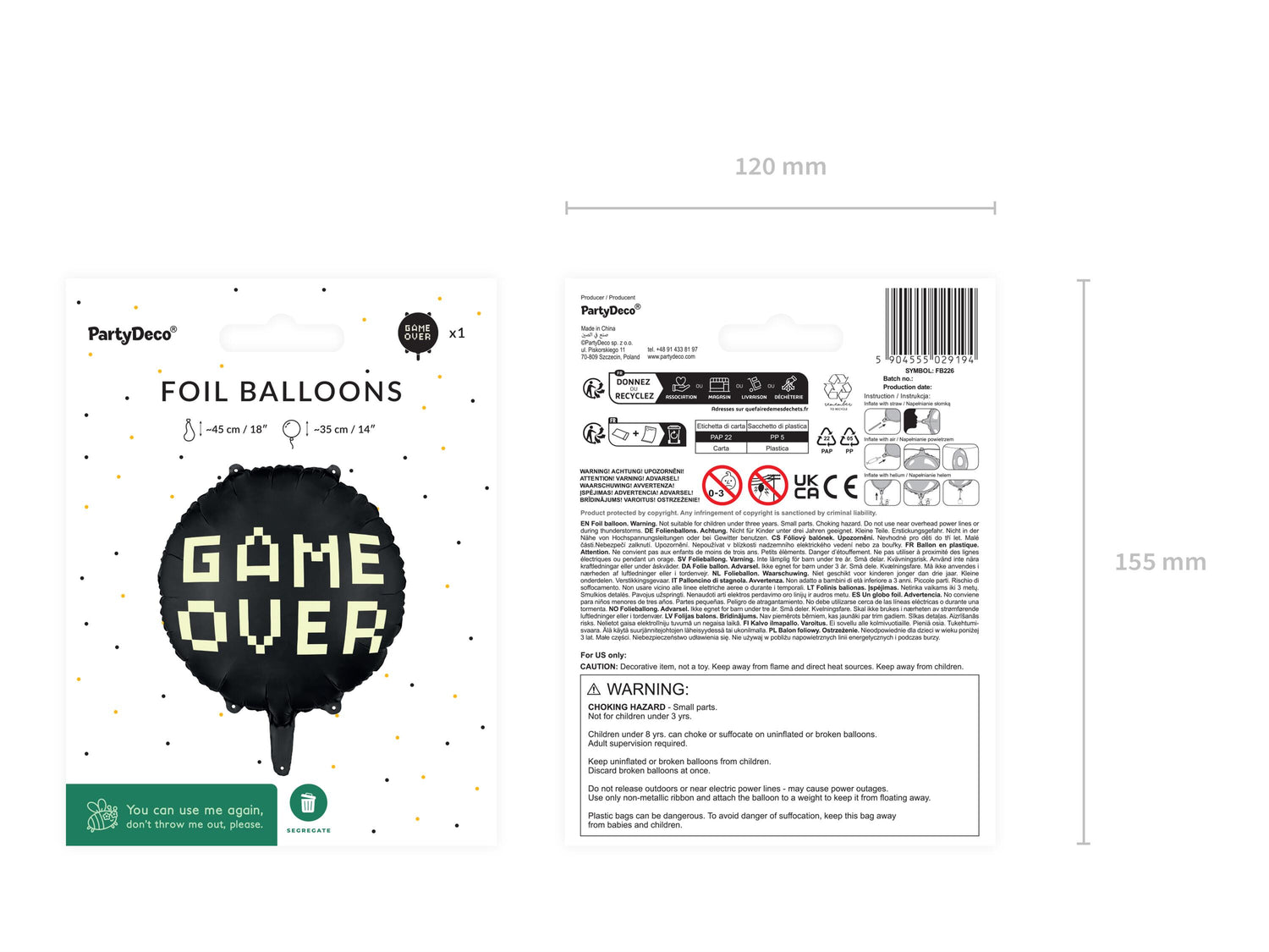 Foil balloon Gamer over in black colour with inscription in beige colour, size before inflation approx. 45 cm (18''), size after inflation appro. 35 cm (14''). Infalte with air and helium. Set contains a straw.