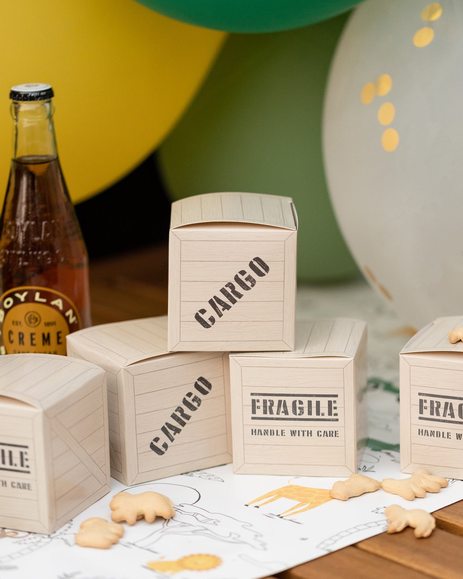 Reward your favorite explorers with delicious treats delivered in these safari inspired favor boxes. Designed to resemble cargo boxes, these favor boxes are the perfect way to add some adventure to your safari themed birthday celebrations!