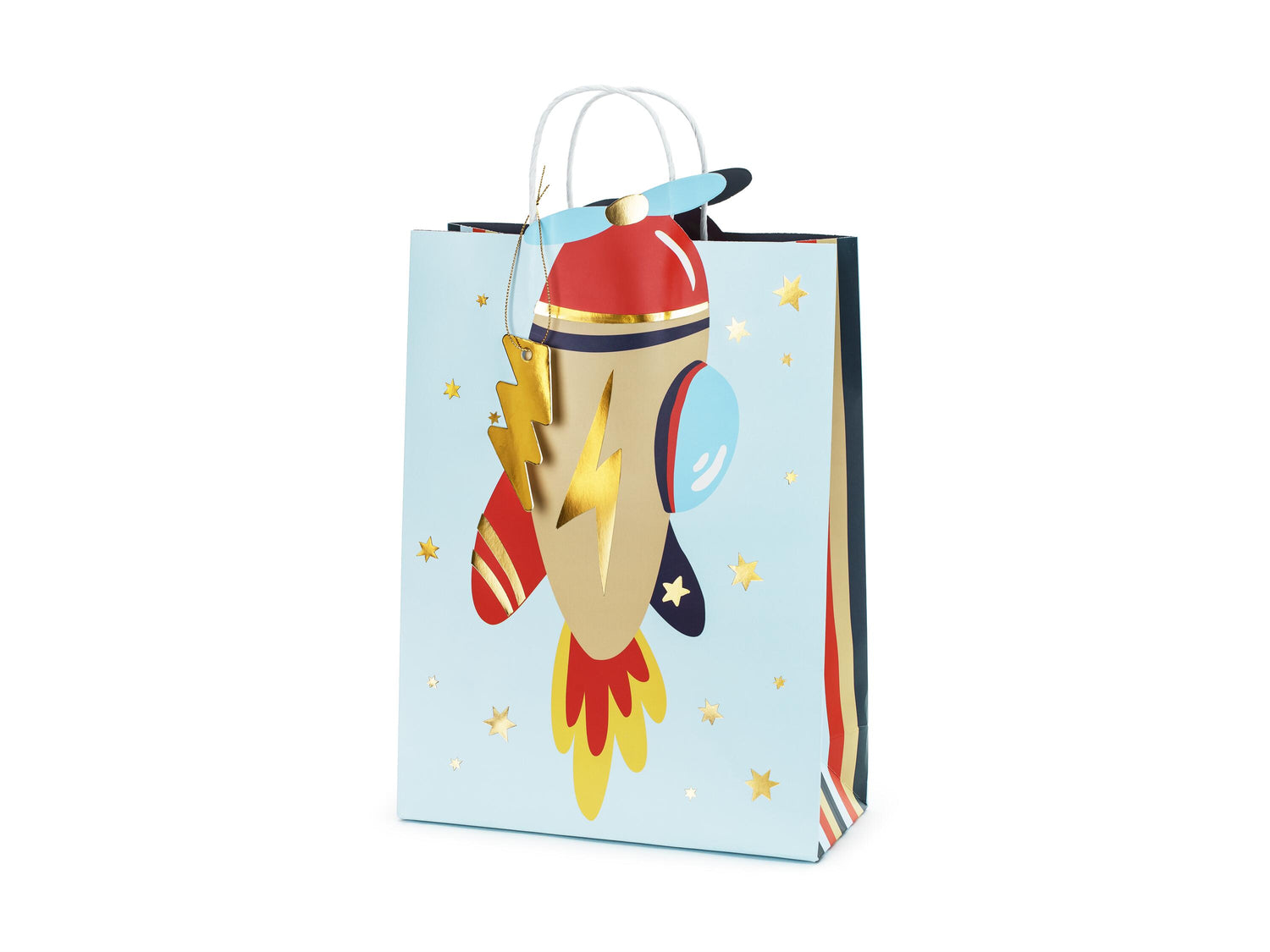 Gift bag Airplane, mix of colours with lightning tag in gold colour, size without handles approx. 10 x 35.5 x 24 cm.
