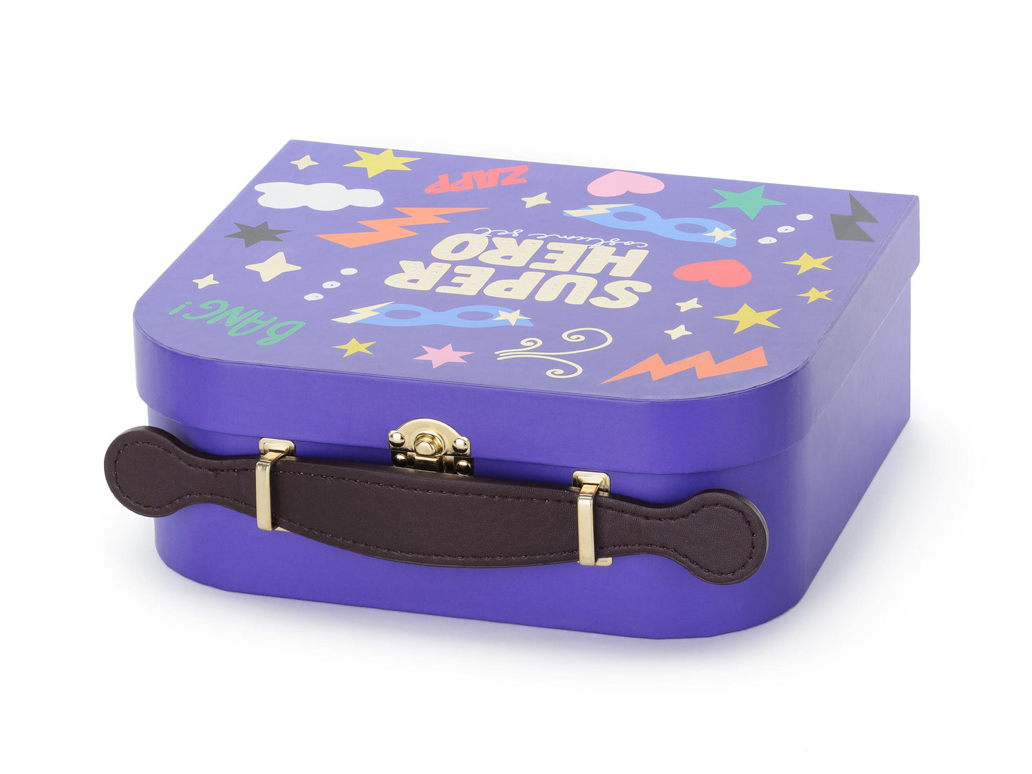 Suitcase with superhero costume, set contains 6 elements (patches, lace accessories, stickers, mask, cape and cuffs ), size of suitcase approx. 8 x 22 x 22.5 cm.