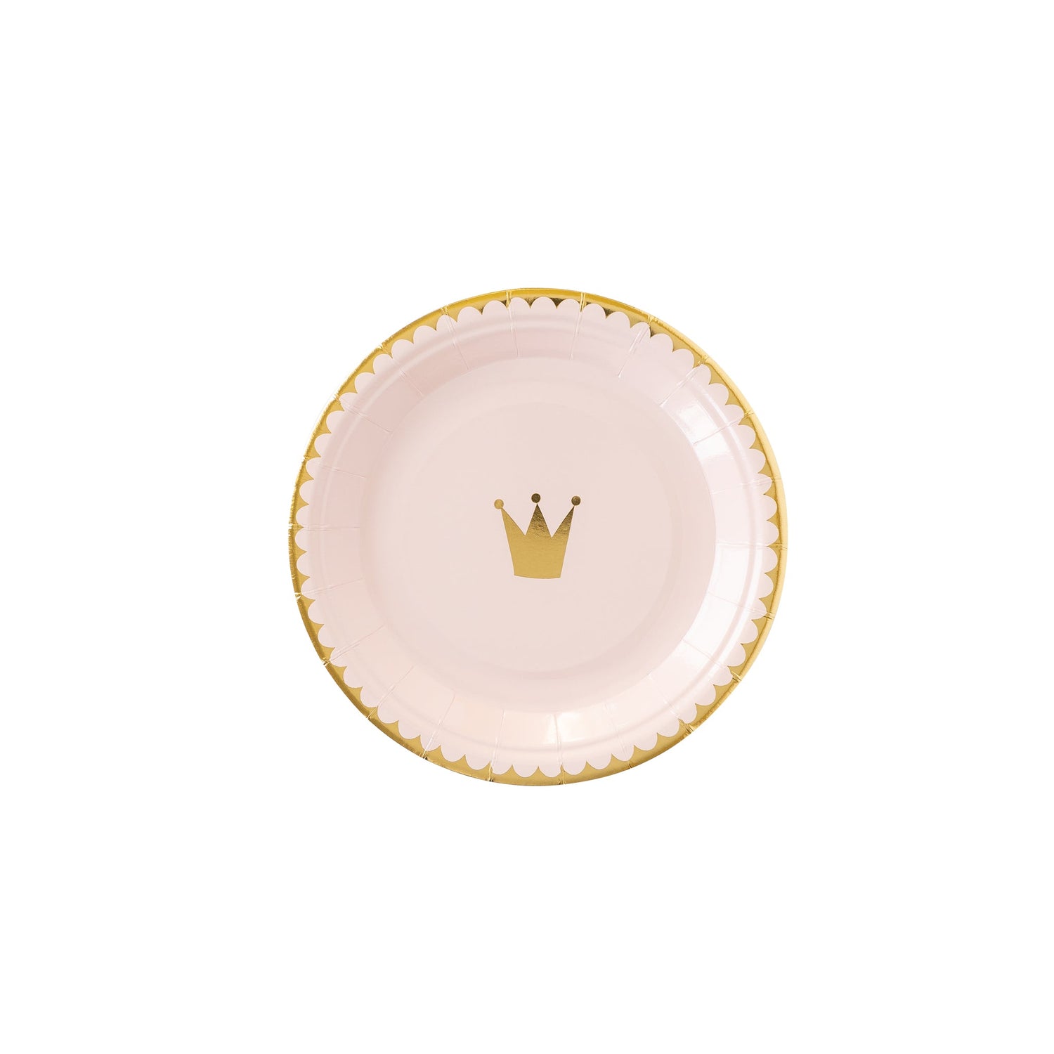 These perfectly pink party plates are fit for royalty with a gold foil crown accent and foil edging. These 7" party plates are perfect for serving birthday cake and cupcakes or dainty finger foods served at a princess tea party.
